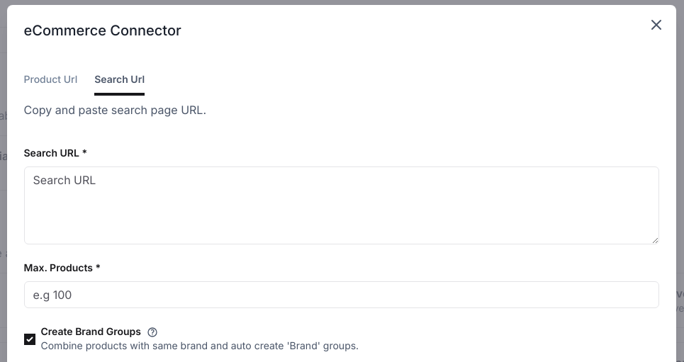 - Create Brand Groups: Select this if you're adding multiple URLs and would like the platform to also combine products of the same brand and create "Brand" groups.