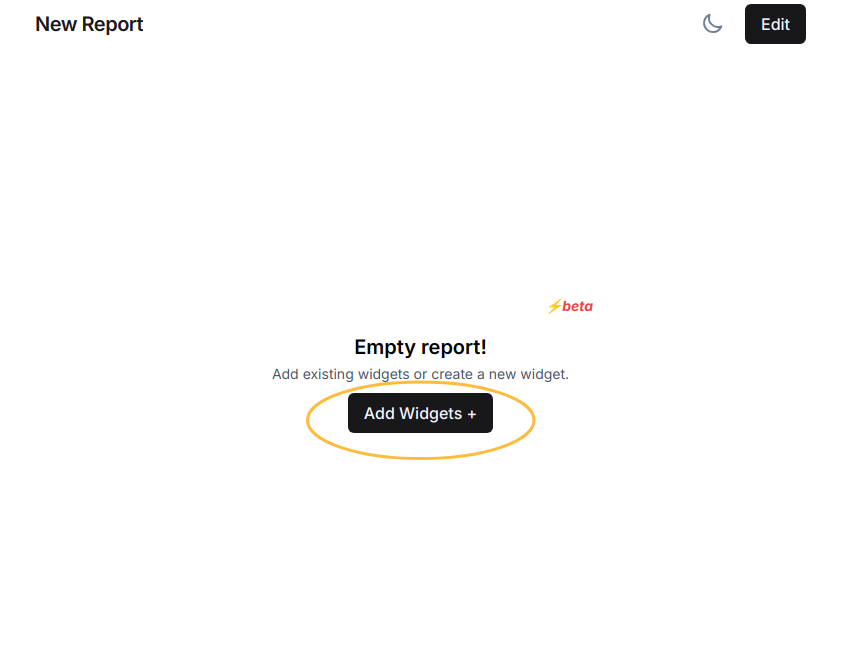 Click on the "Add Widget" button in the center of the page. This will open a modal with all the existing widgets that can be added to the report.